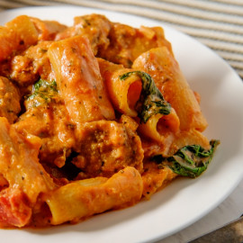 Accueil / plats / Mijoté de Porc sauce tomate basilic, fusilli