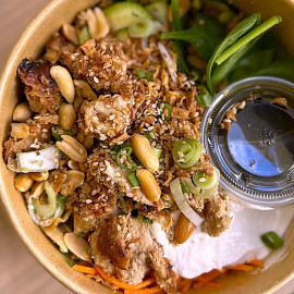 Accueil / plats / Poke Poulet Cacahuètes, Riz, Carotte, Courgette, Sauce Blanche, oignon frit, Sésame